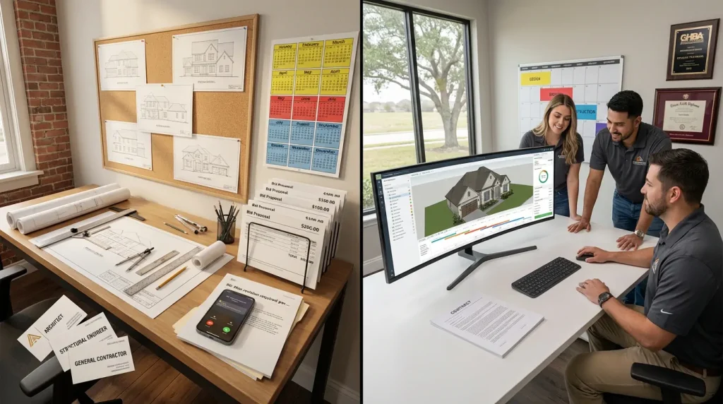 That difference creates practical consequences. In the traditional model, the architect and builder focus on different priorities. The architect handles aesthetics, functionality, and building codes while a separate contractor manages the actual construction cost. We've talked with Cypress homeowners who spent months perfecting plans only to discover no contractor could build them within budget.