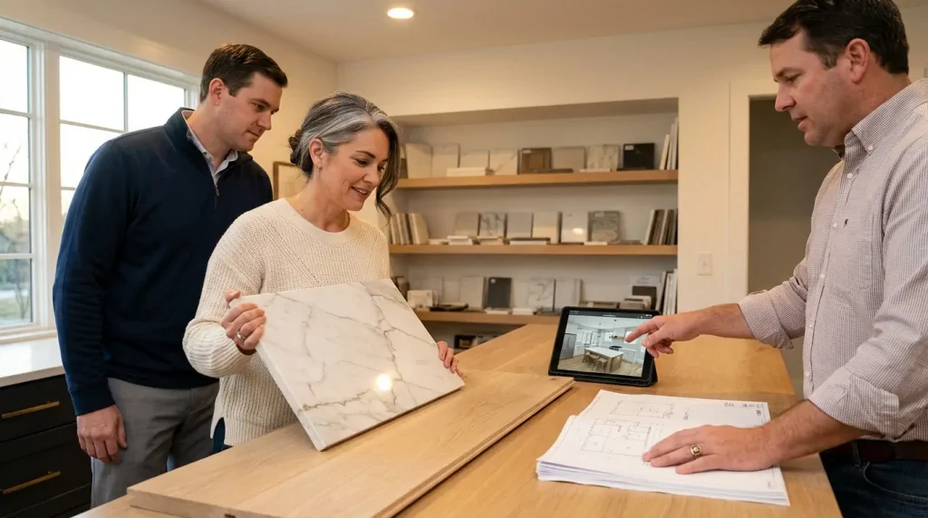 • Design library access — Rather than sending you to fifteen different showrooms, our curated materials library and designer partnership network narrow your choices to pre-vetted options that meet your budget and quality standards.